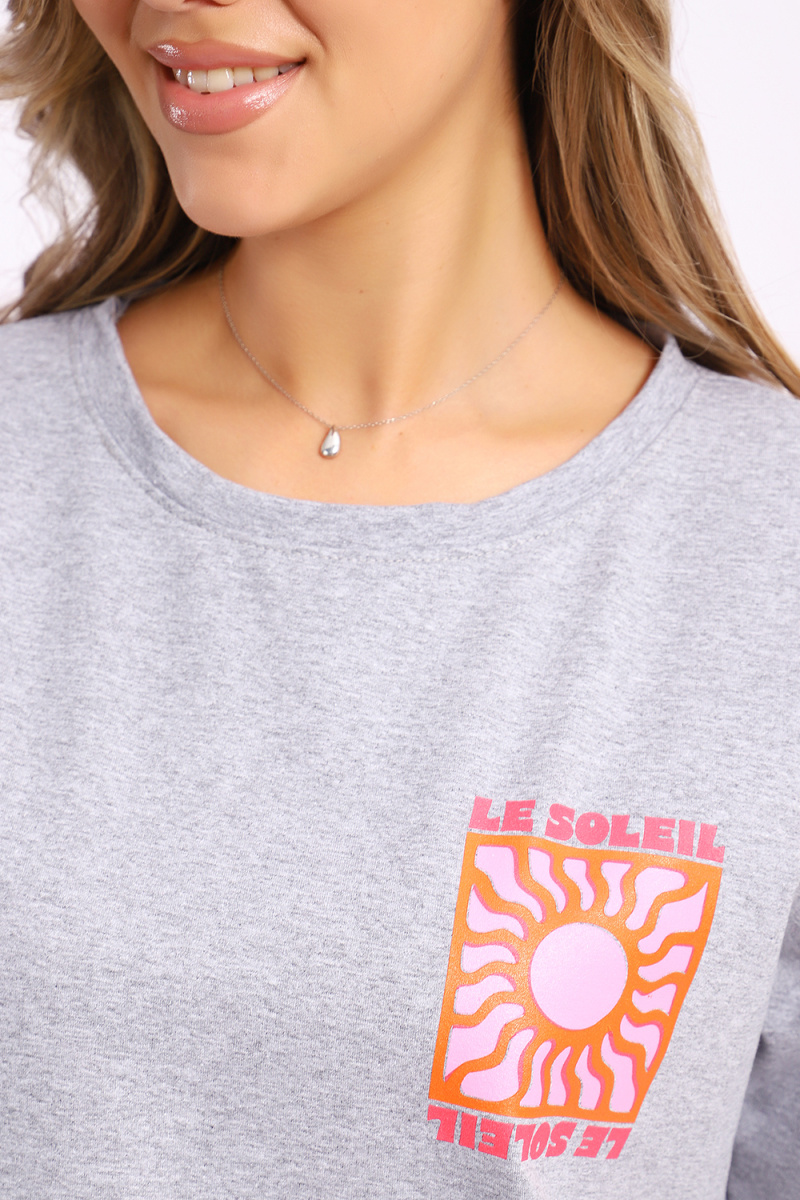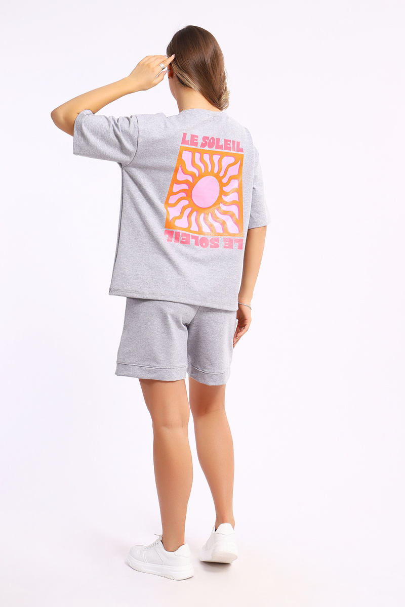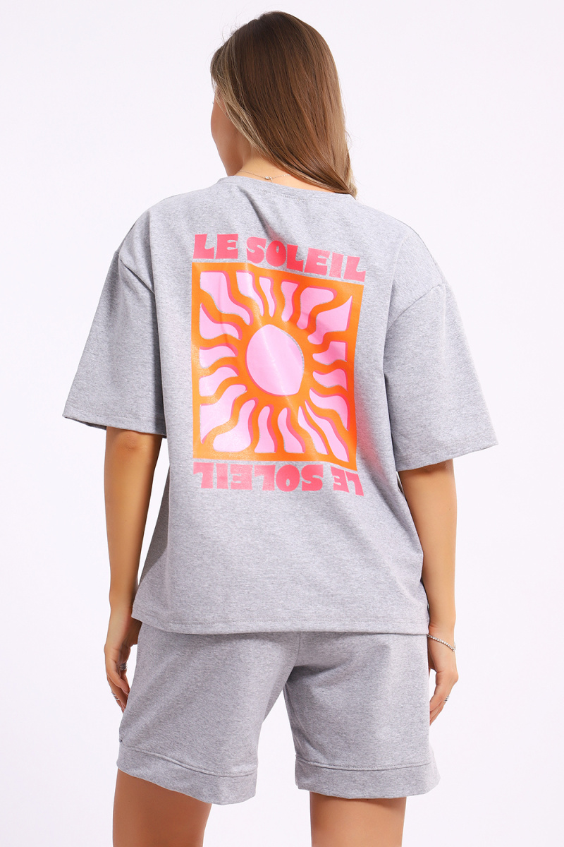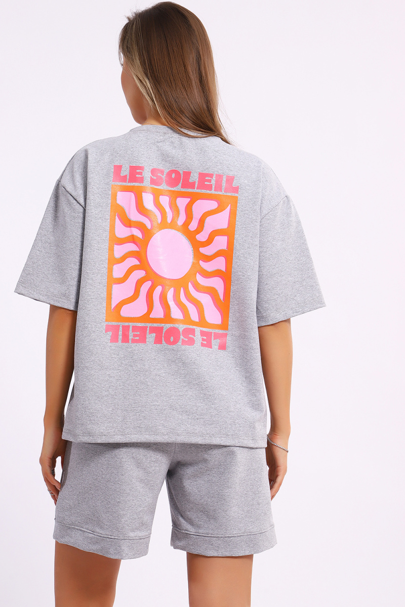 Костюм состоит из футболки и шорт. Футболка свободного кроя с короткими рукавами на спущенном плече. Шорты с накладными карманами и манжетами.