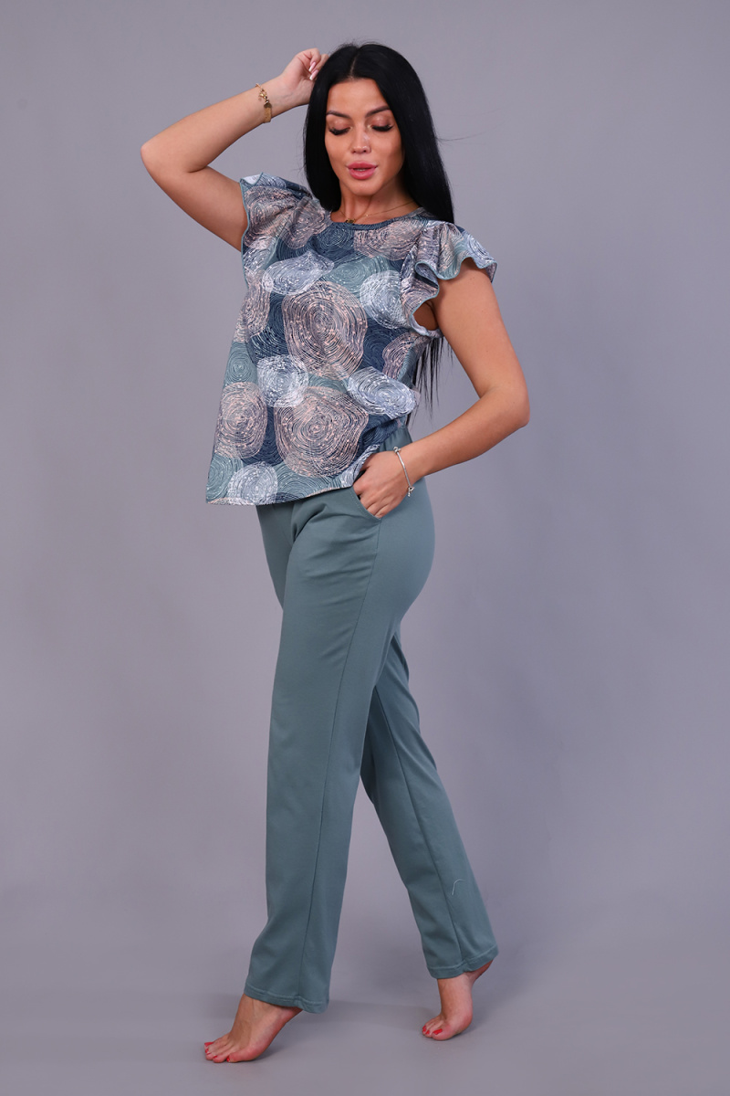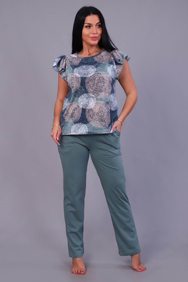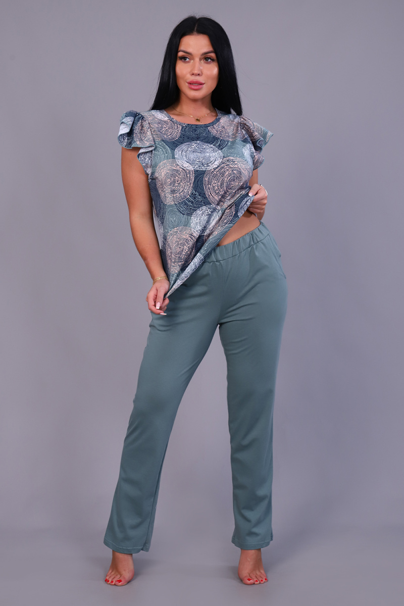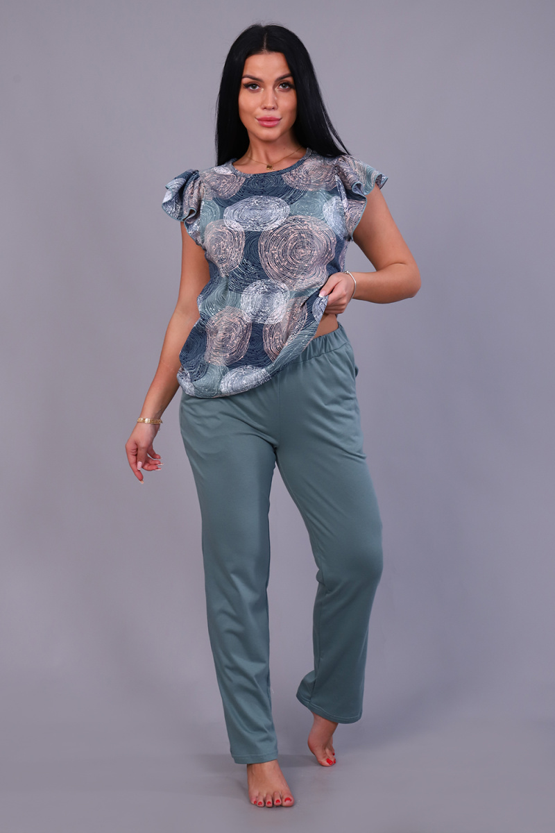 Женский домашний комплект состоит из майки и брюк. Майка полуприлегающего силуэта с округлой горловиной. Брюки прямого покроя с карманами, притачным поясом. Домашний комплект выполнен из кулирного полотна - 100% хлопок.