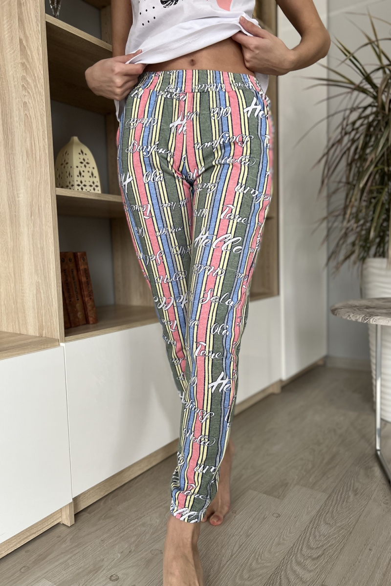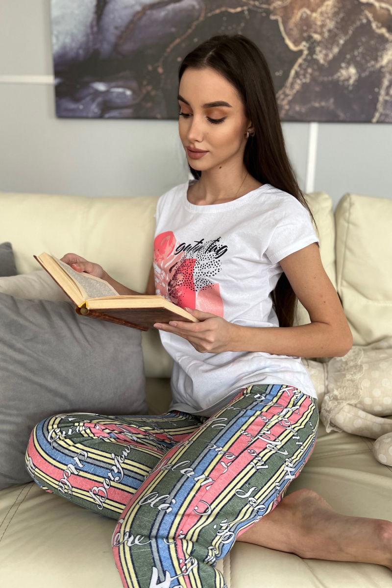 Комплект состоит из футболки и брюк. Брюки свободные, длинные, с карманами, на эластичном поясе, с резинкой по низу. Футболка полуприлегающего силуэта, с округлой горловиной, длиной до середины бедра. Рукав втачной короткий. В верхней части спинки обработан декоративный вырез. Горловина, низ рукавов и вырез на спинке обработаны бейкой из основного полотна с отделочным кантом.